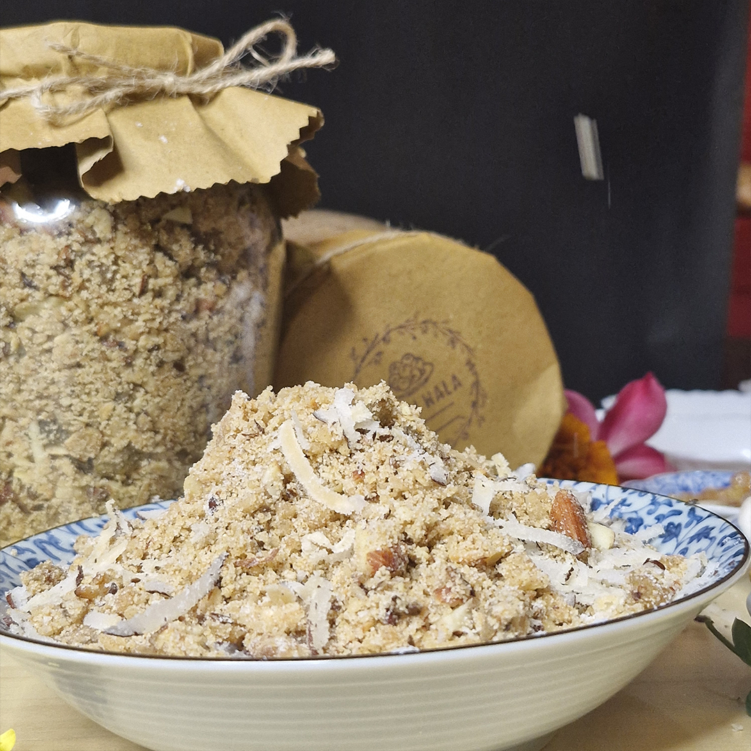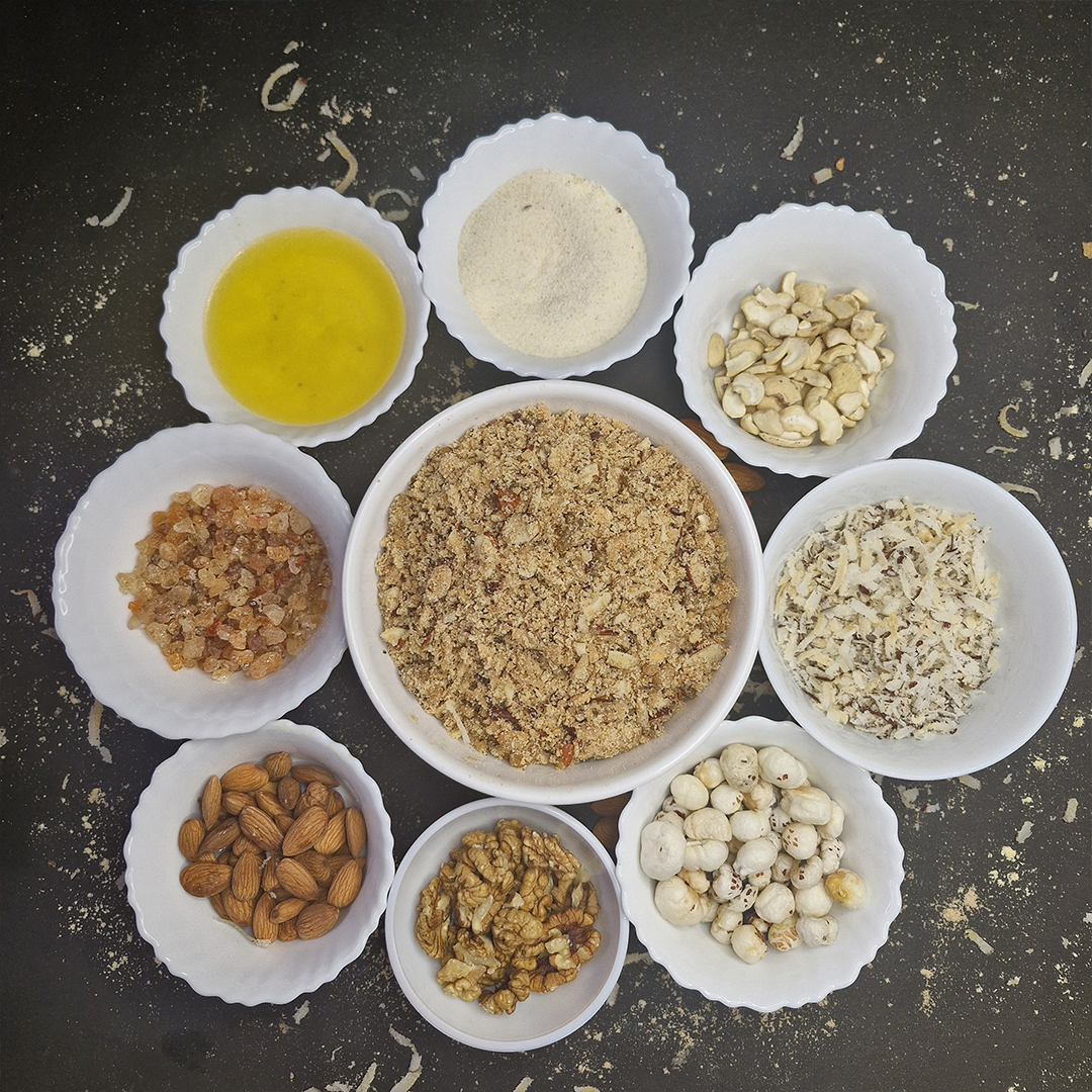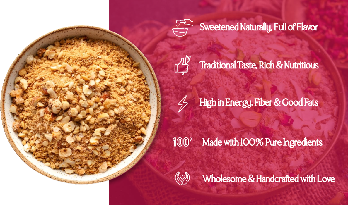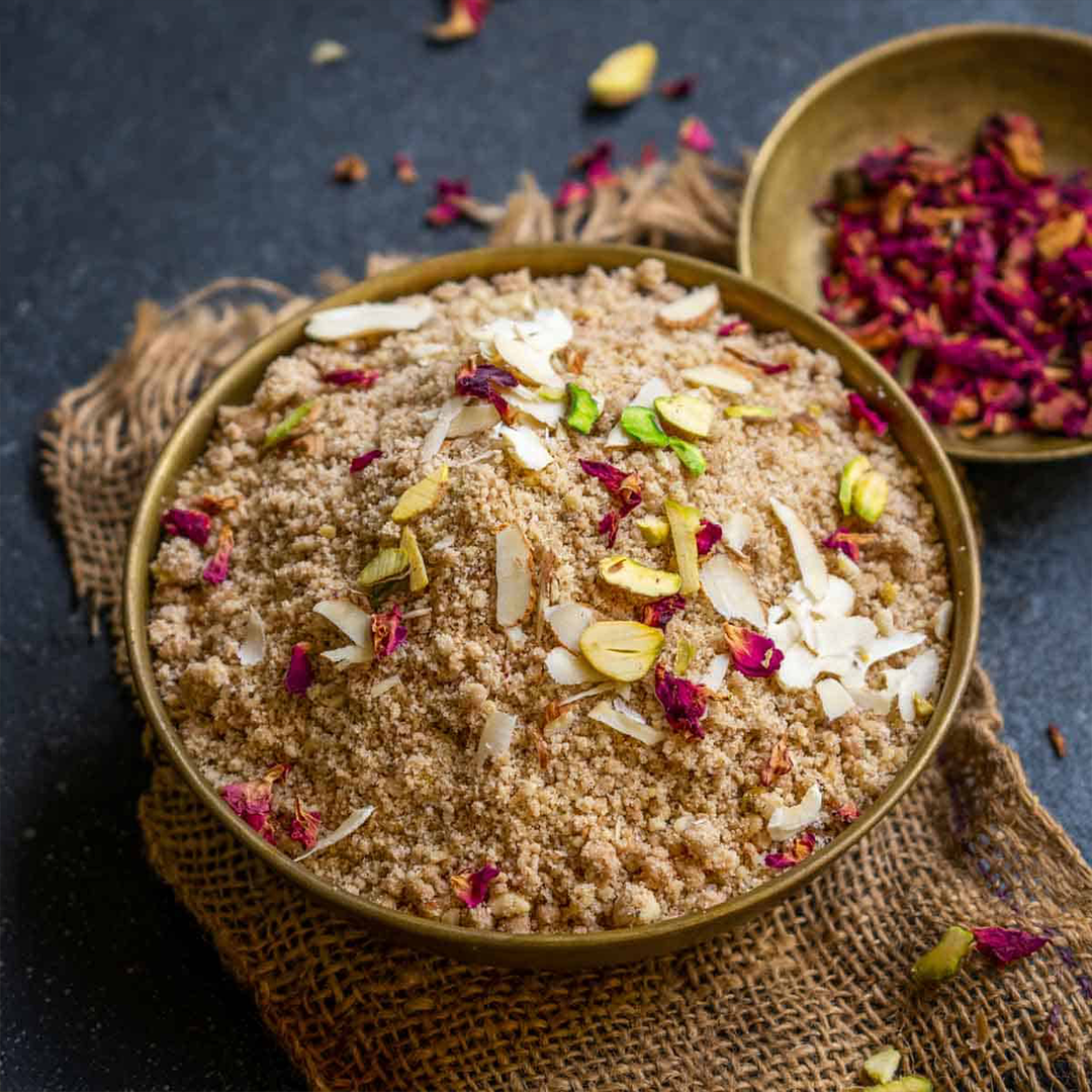 A nutrient-rich sweet made with roasted whole wheat flour, pure desi ghee, and a generous mix of crunchy dry fruits. Panjiri is packed with energy, fiber, and natural goodness, making it perfect for boosting strength and vitality in every bite.